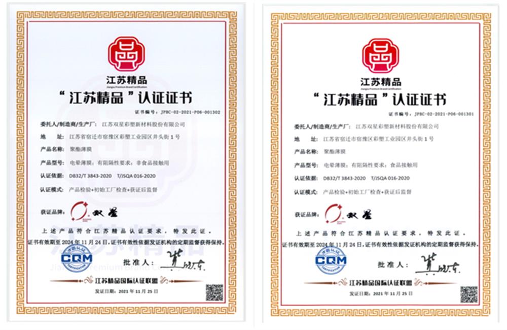 近日公司收到“江苏精品”国际认证联盟发来的“江苏精品”认证证书,双星新材的两款电晕聚脂薄膜产品被正式认定为“江苏精品”,从而标志着双星新材率先跻身“江苏精品”的优质制造业品牌之一。