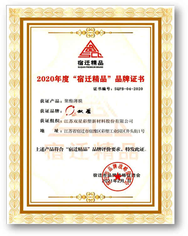 近日,从宿迁市市场监督管理局、宿迁市品牌战略促进会公布的2020年度“宿迁精品”品牌获证企业名单中获知,江苏双星彩塑新材料股份有限公司“双星”牌聚酯薄膜获品牌认证殊荣。