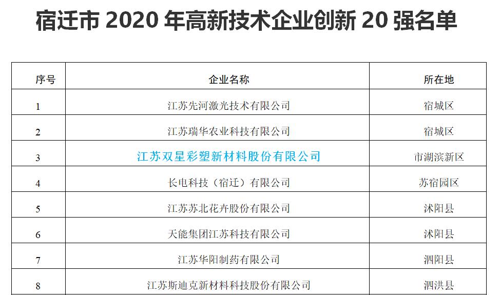 入选宿迁首批高新技术企业20强,是对我公司技术研发实力、专业技术水平和发展潜力的高度肯定。今后,双星新材将继续引入高素质的人才团队,为自主创新提供根本保证;更加注重自主创新、保护知识产权,提升企业核心竟争力;继续加大科研投入,充实企业创新发展后劲;进一步加强公司技术创新能力以及科技成果转化能力,为企业持续、快速发展提供强有力的技术支撑。