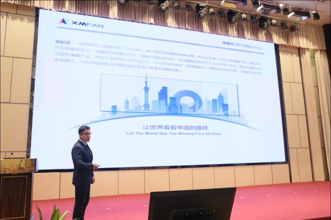 图为公司副总经理工程师陆敬权为来宾介绍双星节能窗膜新品