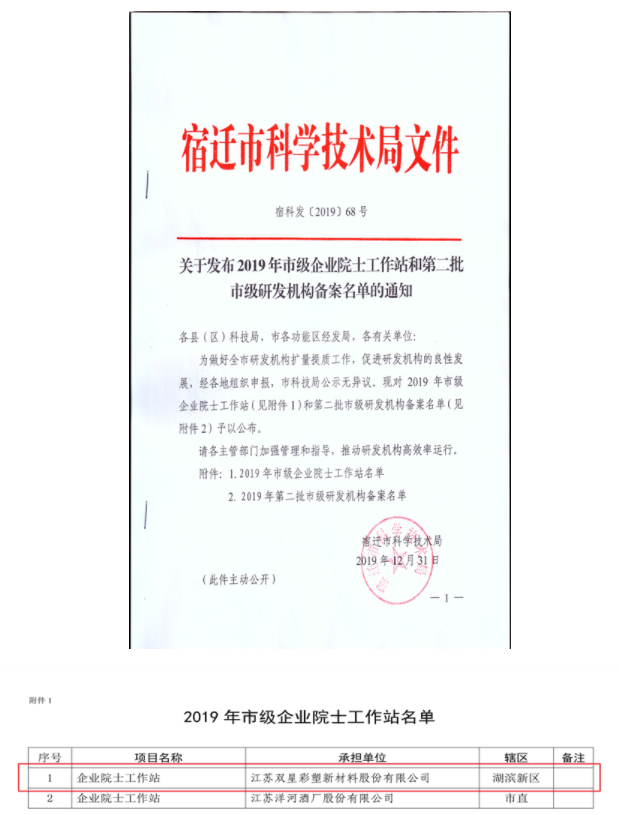近日,从宿迁市科技局公布的2019年市级企业院士工作站名单中,江苏双星彩塑新材料股份有限公司组建的“企业院士工作站”喜获批复建设。