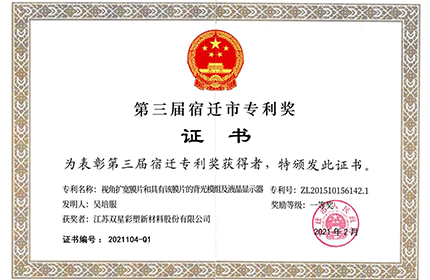 2021年5月7日,全市加快工业经济高质量发展暨招商引资大会上,表彰了第三届宿迁市专利奖获奖单位,公司申报的“视角扩宽膜片和具有该膜片的背光模组及液晶显示器”专利项目荣获一等奖。
