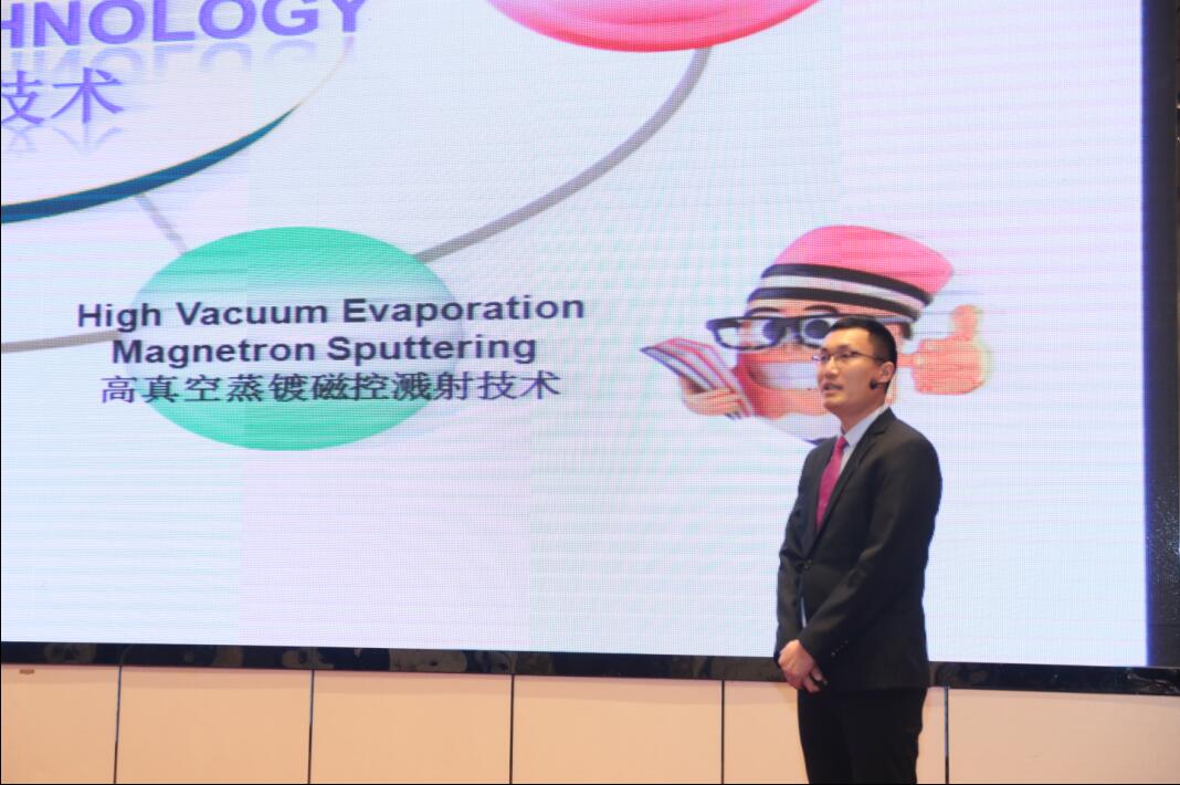 图为公司总经理助理研究所所长朱小磊为来宾介绍光学膜片新品