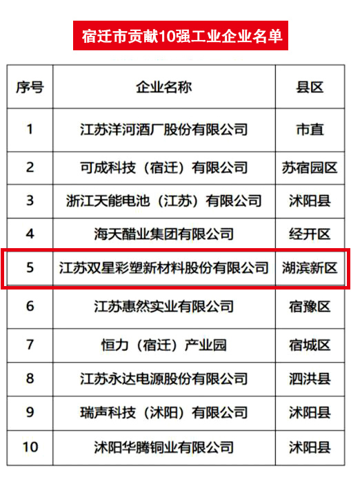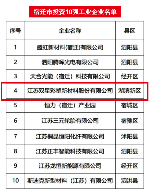 2022年2月18日,全市加快工业经济高质量发展暨招商引资大会上,公布了2021年度“宿迁市贡献10强、投资10强、销售10强”工业企业名单,双星新材喜获“贡献10强位列第5名、投资10强位列第4名、销售10强位列第7名”。