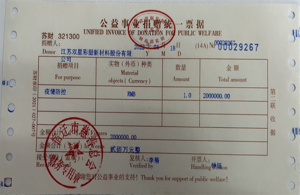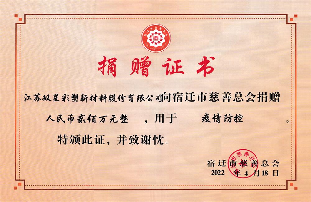 近期,宿迁中心城区转入常态化疫情防控阶段,在“管住”的基础上实现“放开”,迅速恢复经济运行正常秩序,宿迁经济技术开发区等四个功能区是复工复产的主战场。双星新材高度重视,积极响应政府号召, 4月18日双星新材向宿迁市慈善总会捐款200万元,专项用于“四个功能区”常态化疫情防控和中心城区重点医院购买防疫物资。巩固抗疫成果,助力复工复产,全力支援抗击疫情工作,为打赢这场战争贡献一份力量。相信在双星新材和所有爱心人士的帮助下,全民一心、众志成城,疫情定能够早日成为过去。
