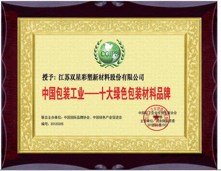 近日,公司被“中国轻工业投资发展协会”授予“中国包装工业——十大绿色包装材料品牌”。