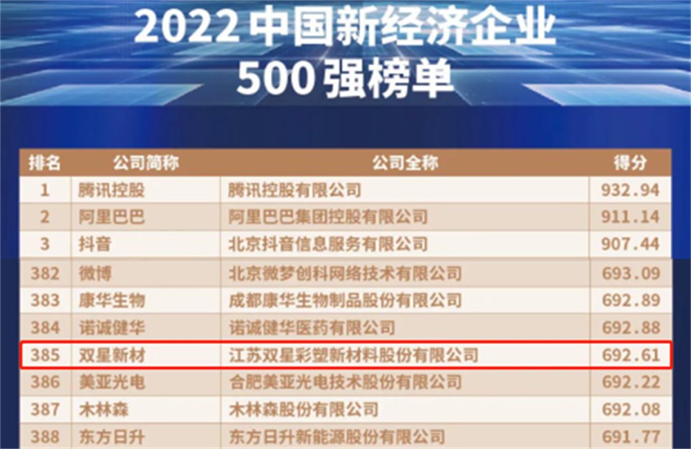 3月30日,2022中国新经济企业500强发布会在北京隆重举行,会上,中国企业评价协会正式发布了“2022中国新经济企业500强”榜单。江苏双星彩塑新材料股份有限公司凭借综合创新实力以692.61分的得分荣登榜单,位列第385位。此次已是双星新材连续两年登录该榜单。
