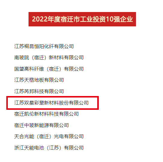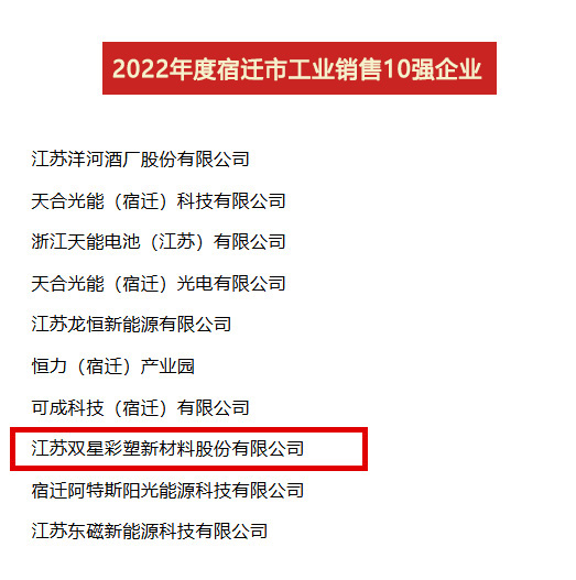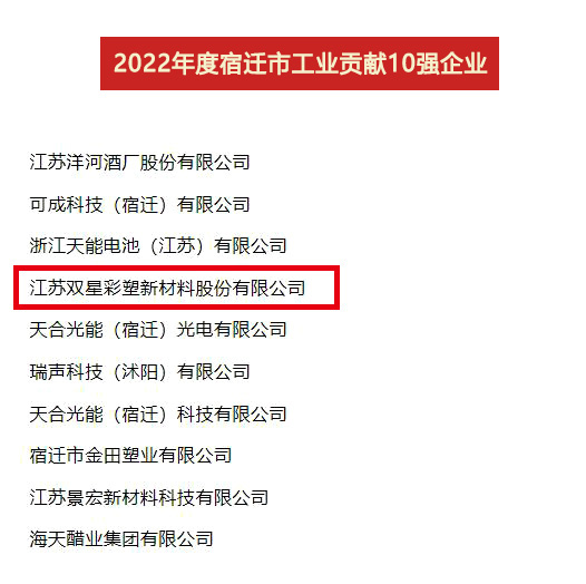 2023年4月7日,全市开发区高质量发展暨工业经济年度表彰大会召开,公布了2022年度“宿迁市工业贡献10强、工业投资10强、工业销售10强”名单,双星新材喜获“贡献10强位列第4位、投资10强位列第6位、销售10强位列第8位”。