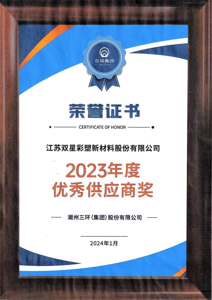 2024年2月6日,双星新材收悉潮州三环(集团)股份有限公司颁发的荣誉证书,在贵司2023年供应商年度评价中,被评为“优秀供应商”。