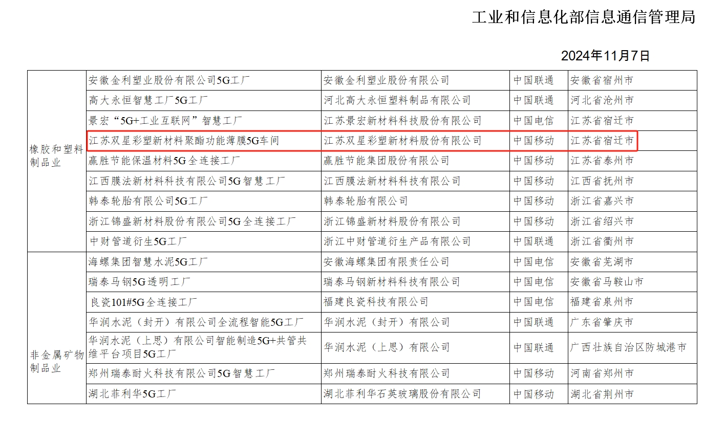 近日,工业和信息化部发布了关于《2024年5G工厂名录》的公示,江苏双星彩塑新材料股份有限公司成功入选。