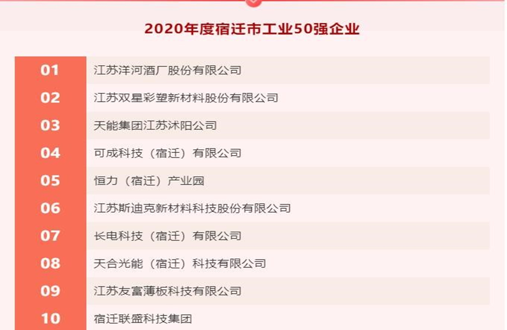 2021年5月7日,全市加快工业经济高质量发展暨招商引资大会上,公布了2020年度“宿迁市工业50强企业”名单,公司喜获殊荣。