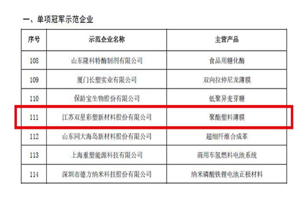 近日,工业和信息化部、中国工业经济联合会公示了第六批国家级制造业单项冠军示范企业名单,江苏双星彩塑新材料股份有限公司凭借聚酯薄膜产品的引领优势和技术创新优势,入选“国家制造业单项冠军示范企业”榜单。制造业单项冠军是指长期专注并深耕于产业链某些特定细分产品市场,在所在领域占有较高市场份额,产品市场占有率位居全球前3位,生产技术或工艺国际领先,创新能力强、质量效益高的企业,发挥着明显的示范带动作用。