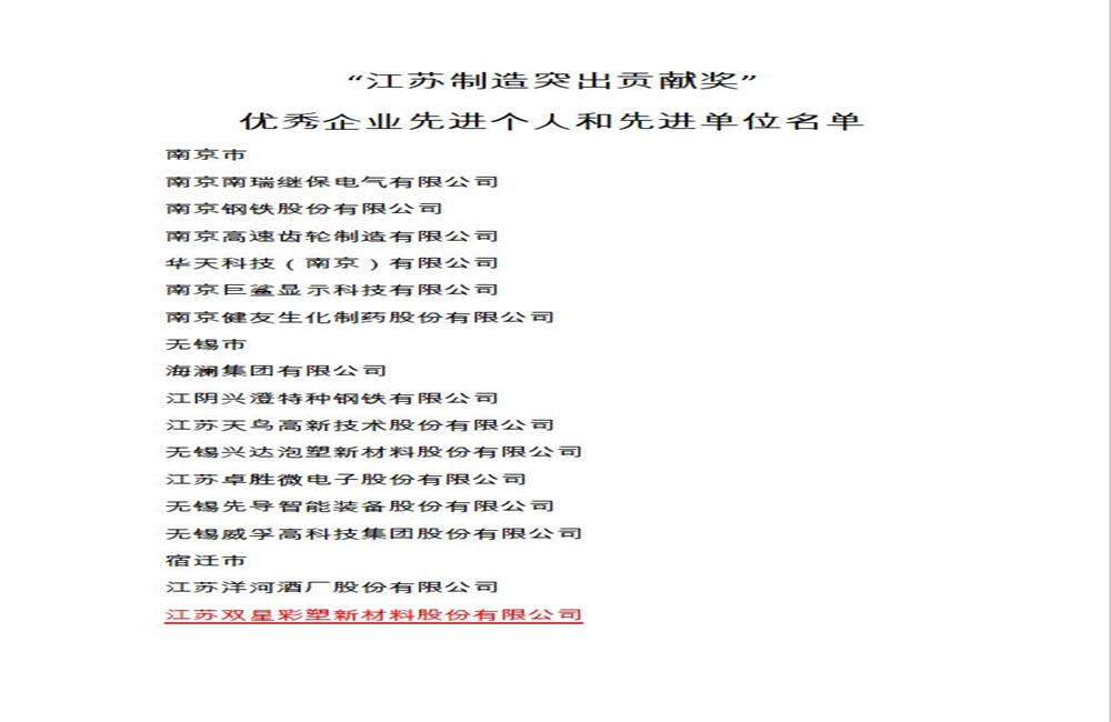 双星新材入选“江苏制造突出贡献奖“优秀企业榜单